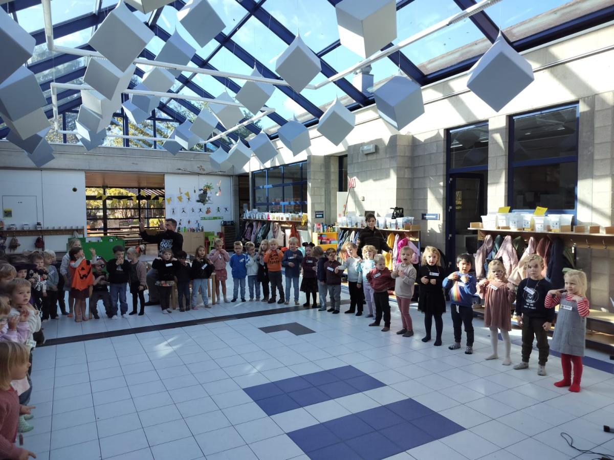 KUNSTKUUR - Sinds begin september zijn we een samenwerking aangegaan met de academie van Zoersel. Zowat elke vrijdag komt er een juf van de academie leuke muzische activiteiten doen met onze 4 en 5-jarige kleuters. Zo ontdekken ze beeld, muziek en expressie eens op een andere manier en ontdekken onze kleuterjuffen/-meester weer wat nieuws binnen deze domeinen. Vrijdag voor de vakantie waren de drie juffen er zelfs samen... en was het thema, hoe kan het ook anders, Halloween!