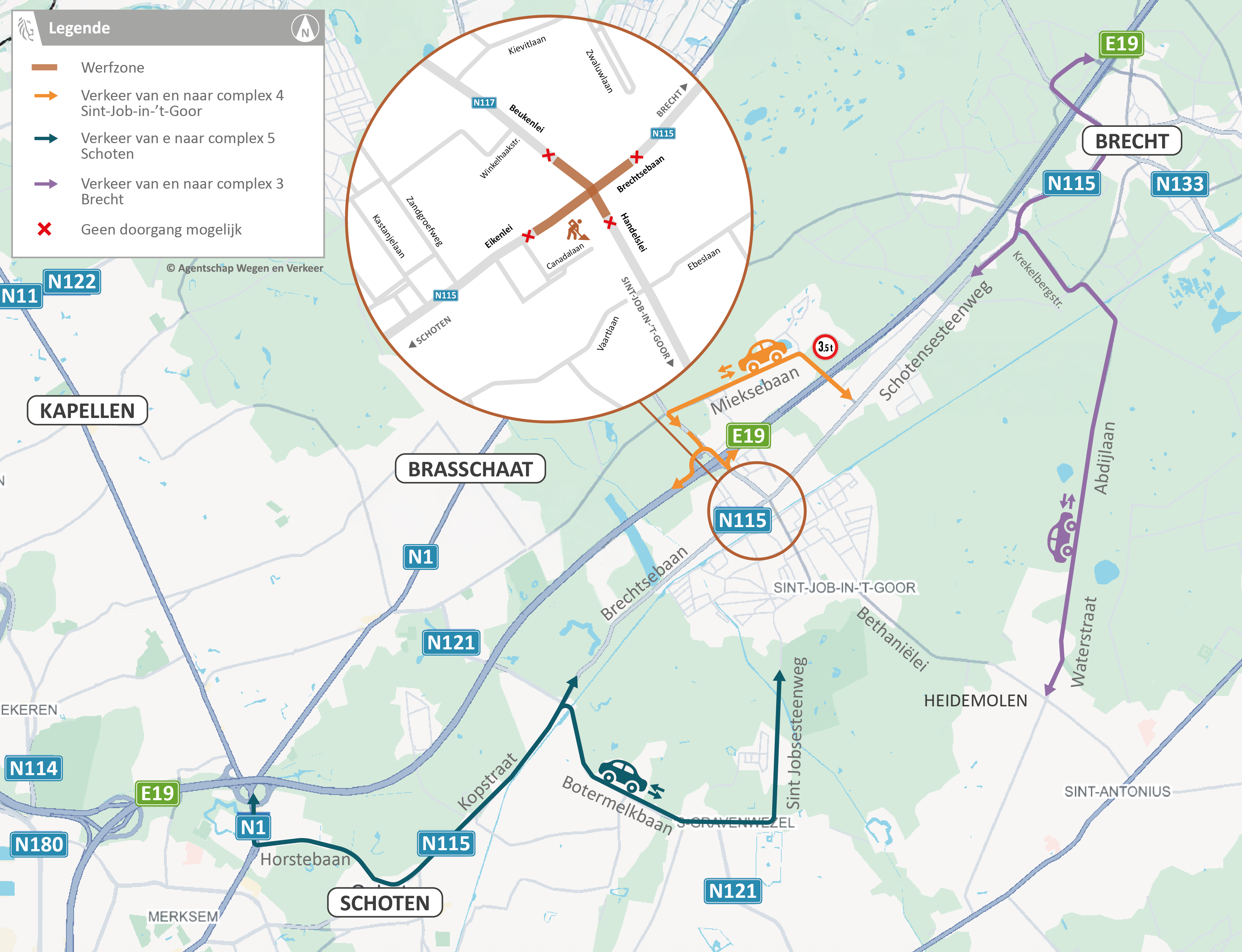 - Vanaf complex Brecht [3] rij je via de N115 naar het kruispunt of via de Krekelbergstraat, Tilburgbaan, Westmallebaan, Abdijlaan, Waterstraat en Bethaniëlei (Schilde) naar het centrum van Sint-Job-in’t-Goor.
