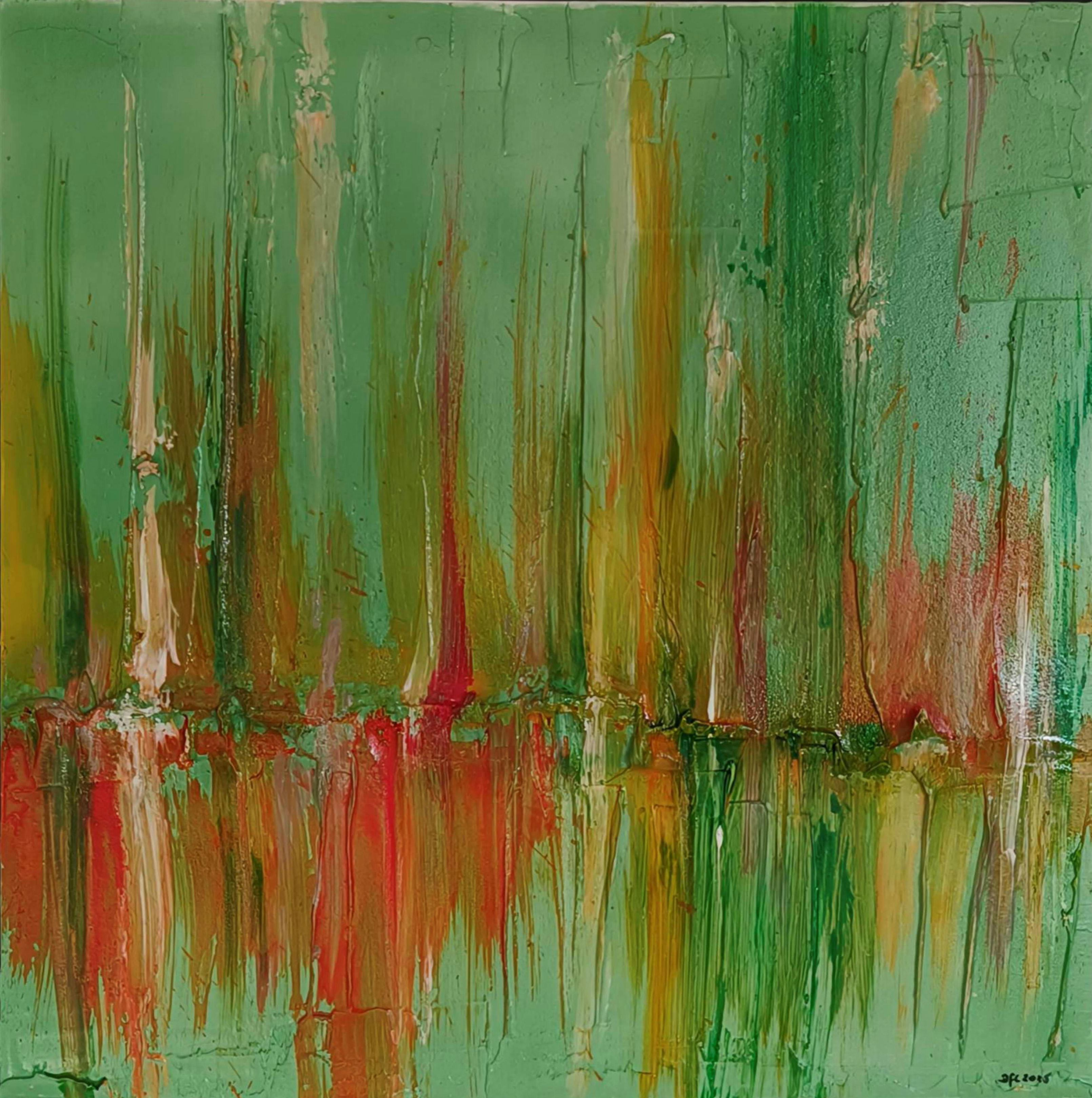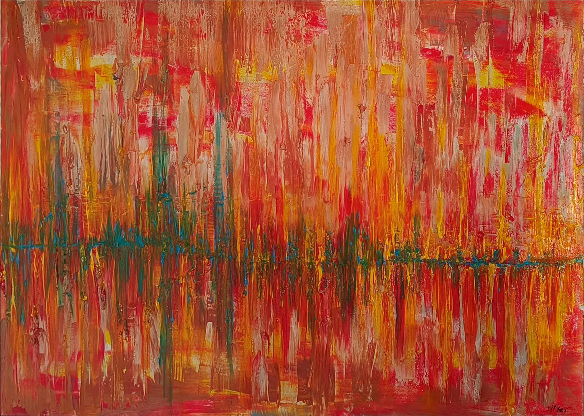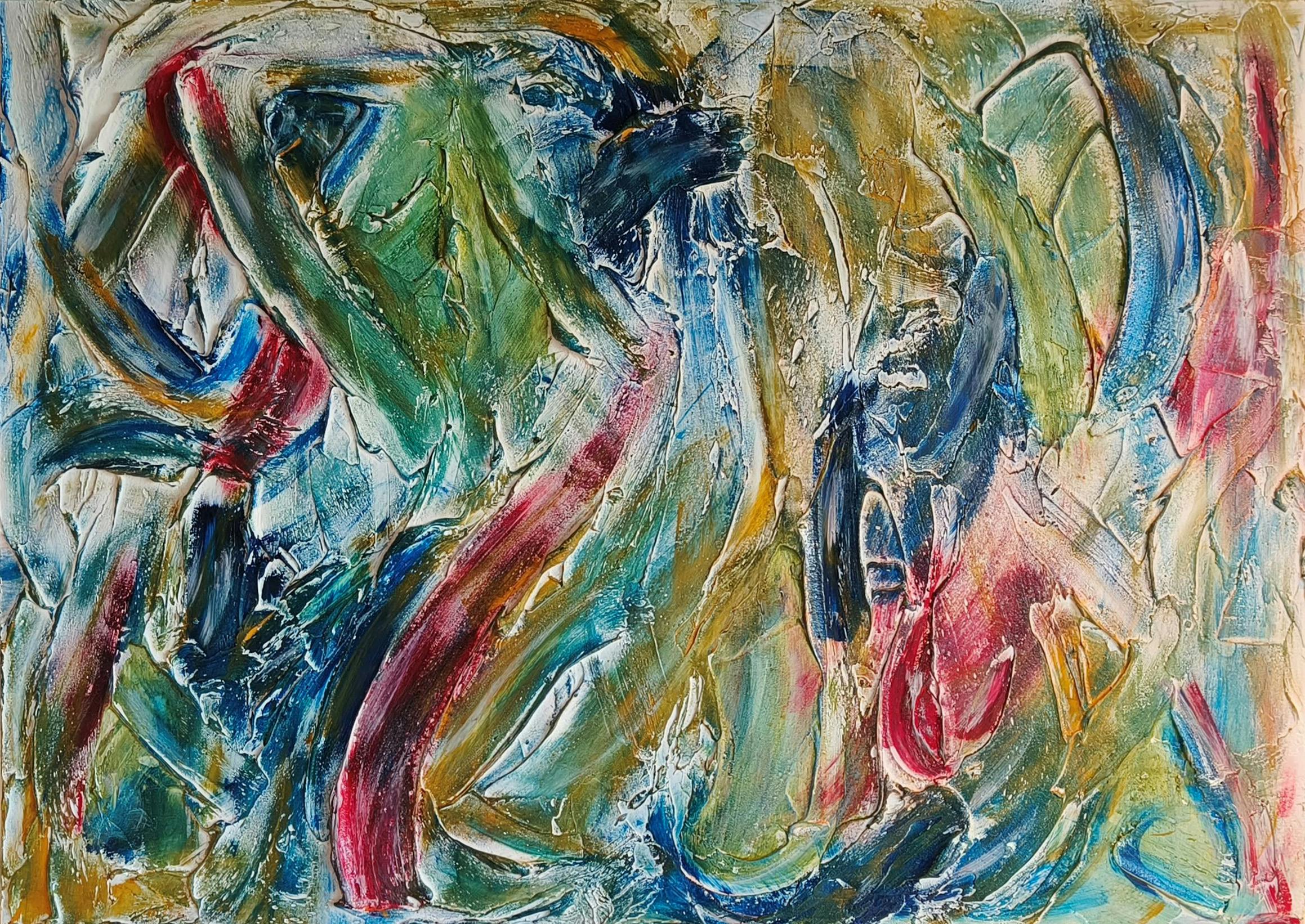 Zijn kleurrijke werken met acryl en plaster op houten panelen geven de kijker het gevoel in een andere emotionale wereld te treden.